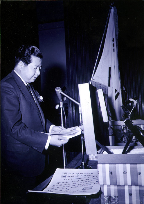 참석자 : 김상협 문교부 장관 5월문예상 시상식에 참석해 연설하고 있는 김상협 문교부 장관.