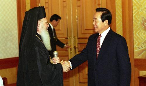 참석자 : 김영삼 대통령, 바르톨로메우스 동방정교회 총대주교 인물상세정보 : 김영삼 대통령(우) 바르톨로메우스 동방정교회 총대주교(좌) 김영삼 대통령이 10일 상오 청와대에서 동방정교회(그리스정교)의 바르톨로메우스 총대주교의 예방을 받고, 상호 관심사에 대해 환담을 나누었다.