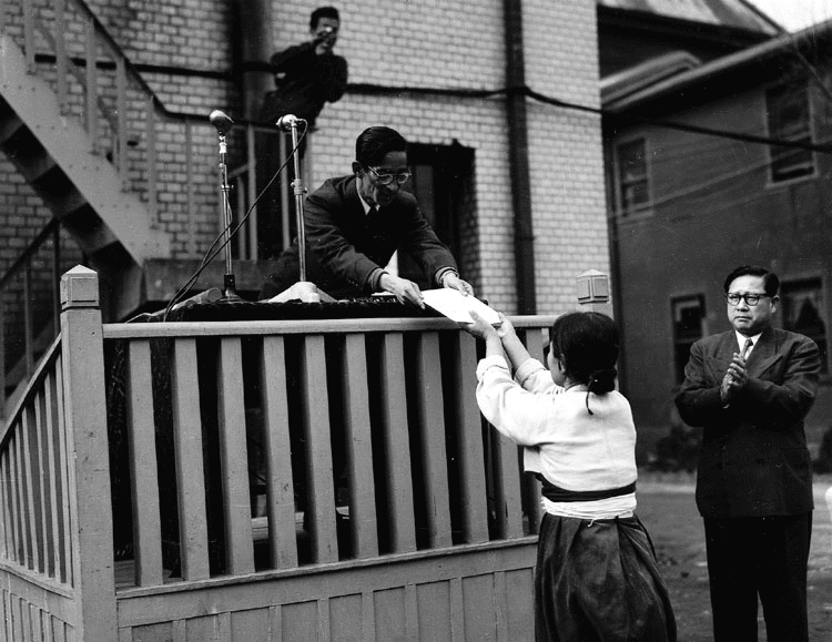 참석자 : 미상 한 극빈자가 가옥 인수증을 받고 있다.