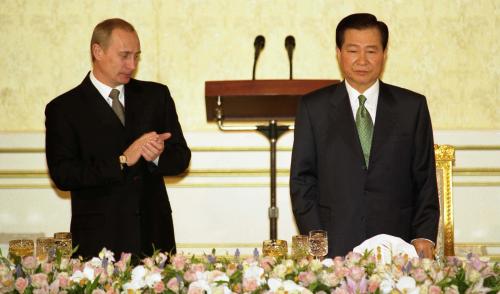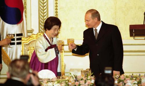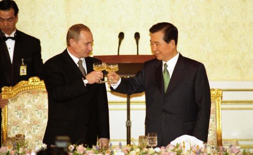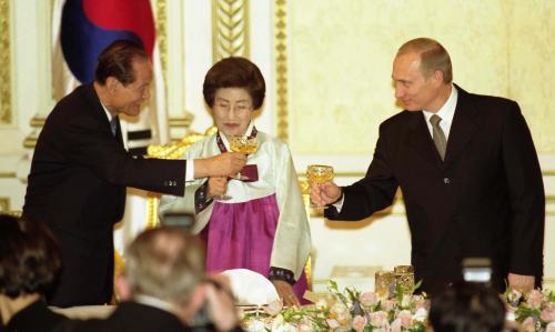 참석자 : 김대중 대통령, 러시아 블라디미르 푸틴 대통령 김대중 대통령은 27일 단독-확대 정상회담과 공동기자회견에 이어 러시아 블라디미르 푸틴 대통령과 국빈만찬을 하고 있다.