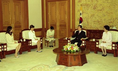 김대중 대통령이 청와대에서 한ㆍ일 친선외교사절인 영화배우 김윤진과 후지와라 노리코를 접견하였다.