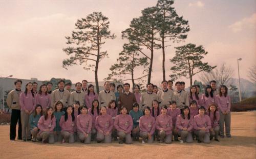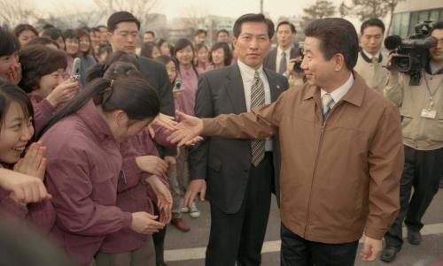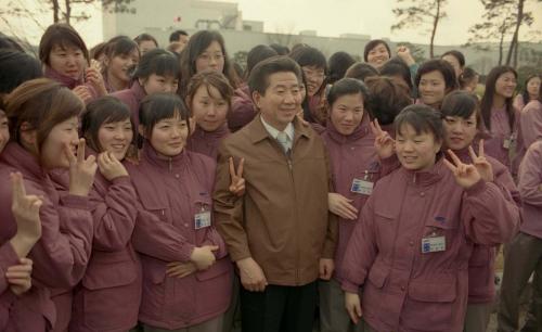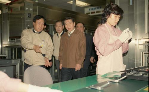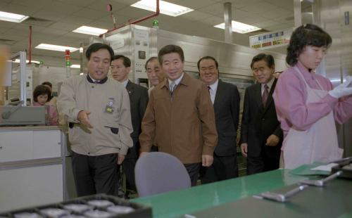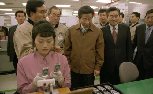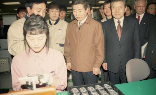 노무현 대통령이 6일 삼성전자 구미사업장을 방문해 윤종용 삼성전자 부회장으로부터 회사 현황을 듣고 휴대전화 생산라인을 둘러본 뒤 사내식당에서 근로자들과 오찬을 함께 하면서 삼성의 '우수성'을 극구 칭찬했다.