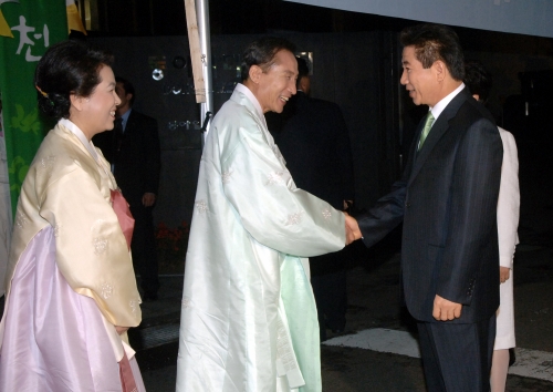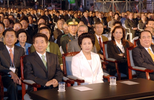 참석자 : 노무현 대통령, 이명박 서울시장, 권양숙 영부인 노무현 대통령이 청계천 새물맞이 통수식에 참석했다.