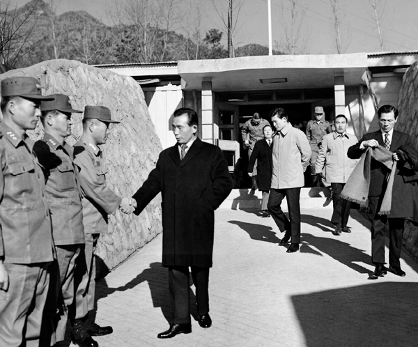 참석자 : 박정희 대통령 인물상세정보 : 박정희 대통령(좌4) 박정희 대통령 수도권 방어 시범훈련 참관 후 군 관계자들 격려 71.1.15