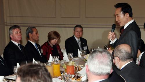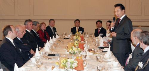 G20 금융정상회의에 참석하기 위하여 영국을 방문중인 이명박 대통령이 3일 런던 랜드마크 호텔에서 영국 내 친한단체 대표 및 유력인사들과 조찬 간담회를 갖고 글로벌 경제위기와 관련하여 '다른 나라와 마찬가지로 한국도 예외없이 어려움을 겪고 있지만 비교적 빠른 시간내에 회복시기를 맞이할 것으로 생각한다'고 밝혔다.