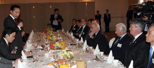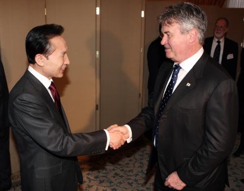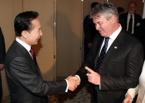 참석자 : 이명박 대통령, 김종훈 외교통상부 통상교섭본부장, 네덜란드 거스 히딩크 첼시축구단 감독, 영국 존 커 한영 미래포럼 회장, 영국 제임스 그레이슨 재영한국학회 회장, 영국 스윈델스 한국전 참전용사협회장