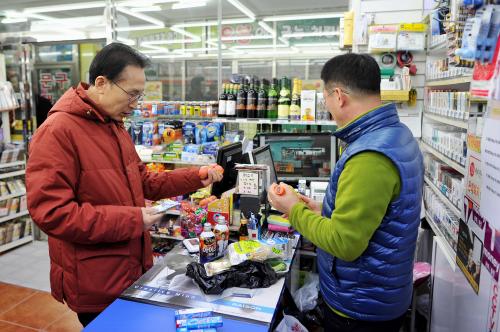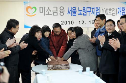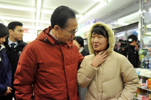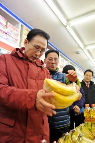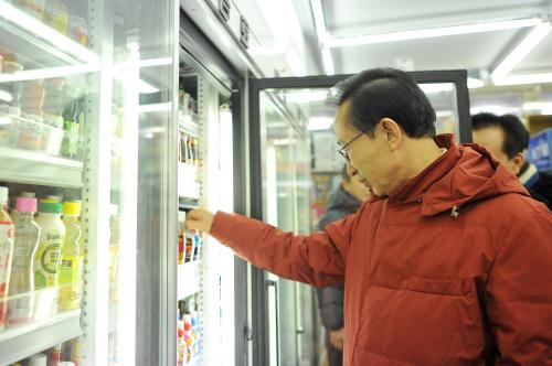 참석자 : 이명박 대통령 이명박 대통령이 16일 오전 서울 노원구 상계동 주공아파트 단지내 나들가게를 방문해 매장을 둘러보고 있다