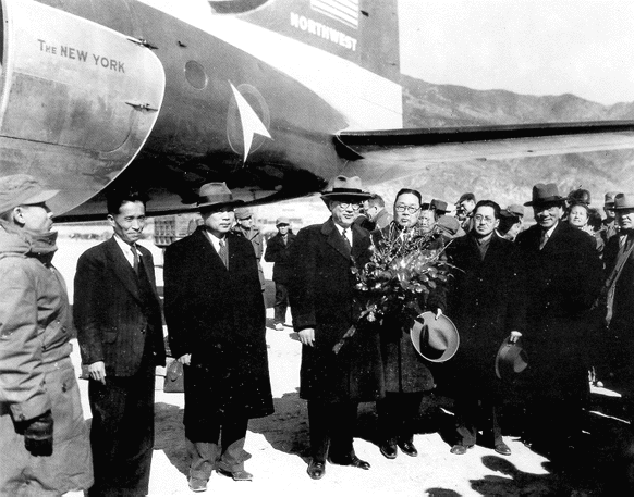 참석자 : 장면 국무총리 인물상세정보 : 장면 국무총리(좌4) 장면 국무총리 일행이 해상이동방송선 시찰을 위해 막 비행기에서 내렸다.