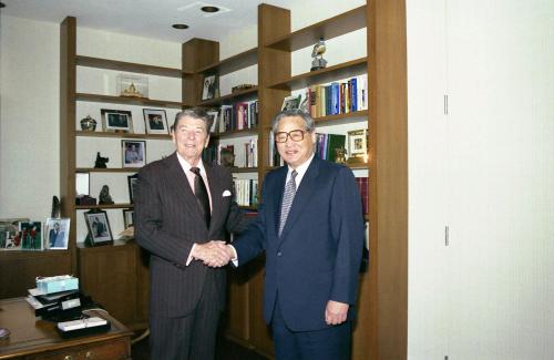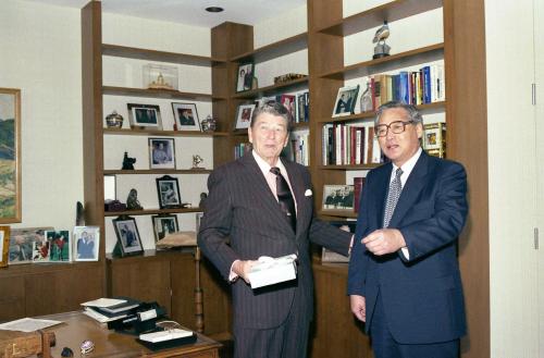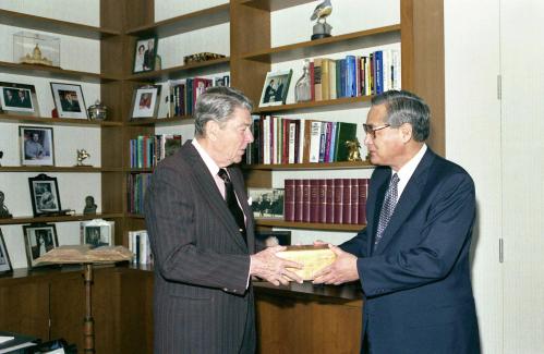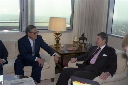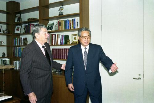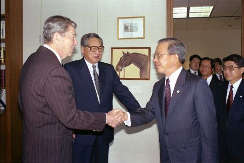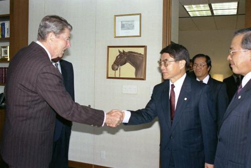 참석자 : 정원식 국무총리, 레이건 전 미국대통령 예방 정원식 국무총리가 레이건 전 미국대통령을 예방하고 있다.