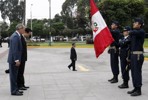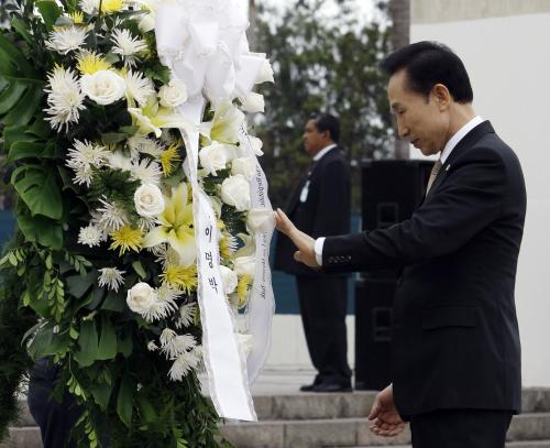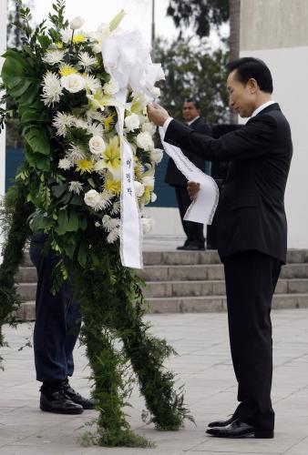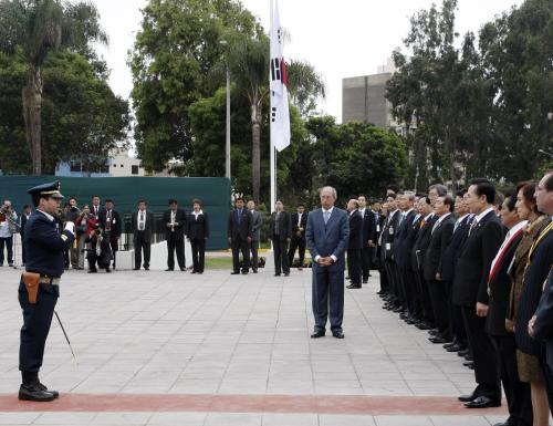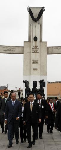 정상회의 참석차 페루를 방문중인 이명박 대통령이 페루의 수도 리마시내 독립기념광장에서 포르투나토 의전장의 안내를 받으며 독립기념비에 헌화했다.