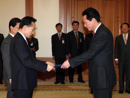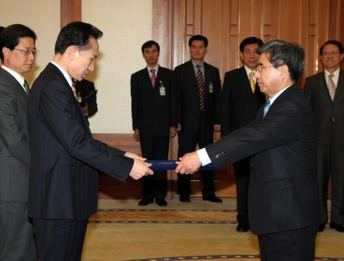 이명박 대통령이 청와대에서 원세훈 국정원장이 배석한 가운데 국가정보원 제1.2.3차장에게 임명장을 수여했다.