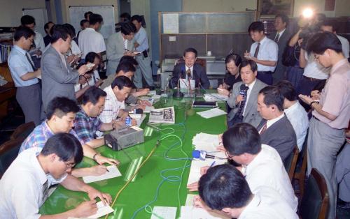 참석자 : 오인환 공보처 장관, 기자단 인물상세정보 : 오인환 공보처 장관(우1) 오인환 공보처 장관이 김일성 사망에 대한 정부대책을 발표하고 있다.