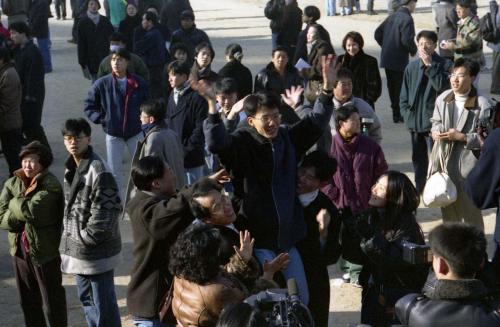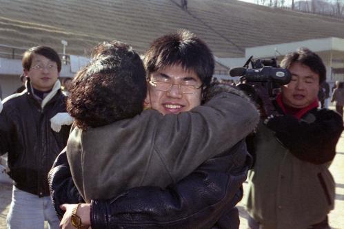 참석자 : 미상 서울대학교에서 합격자 발표 후 합격자와 가족들이 기뻐하고 있다.