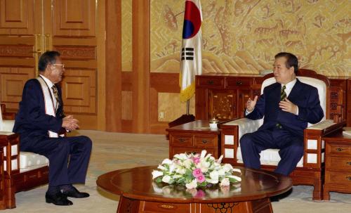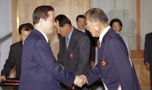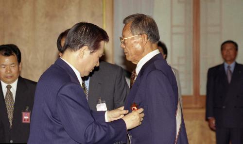 김대중 대통령이 청와대에서 방일영 전 조선일보 고문에게 문화발전에 기여한 공로로 금관문화훈장을 수여했다.