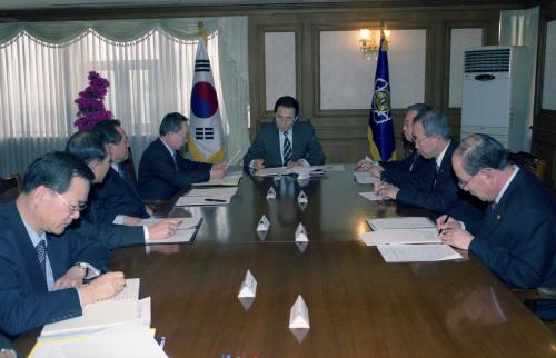 참석자 : 고건 국무총리, 안병영 교육인적자원부 장관, 반기문 외교통상부 장관 인물상세정보 : 고건 국무총리(좌1) 고건 국무총리가 집무실에서 열린 경제ㆍ외교ㆍ안보관계장관회의를 주재하였다.