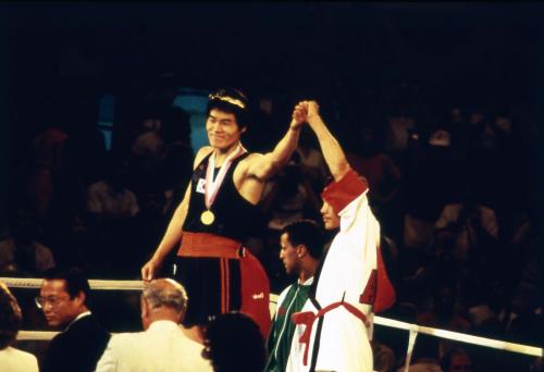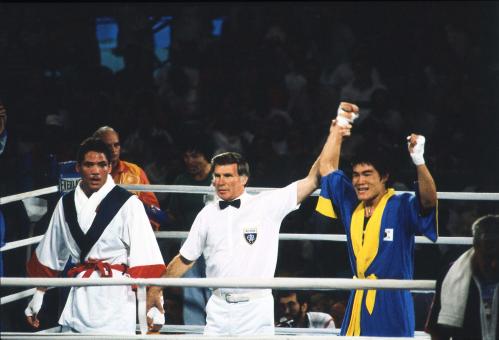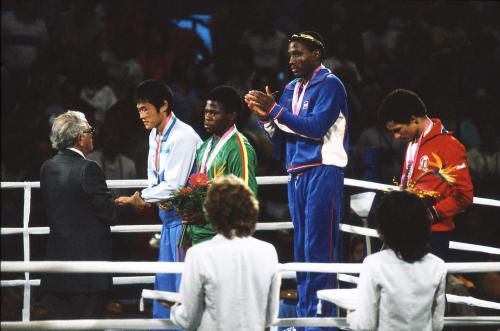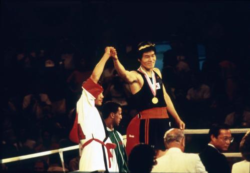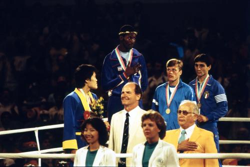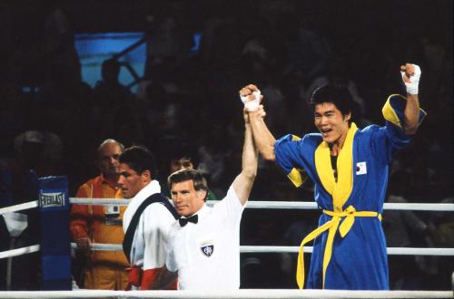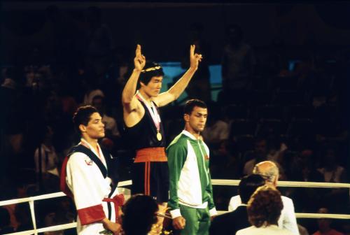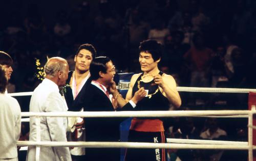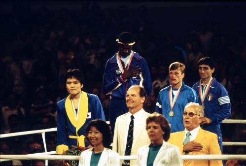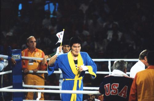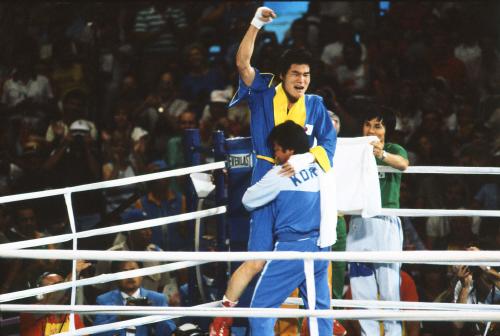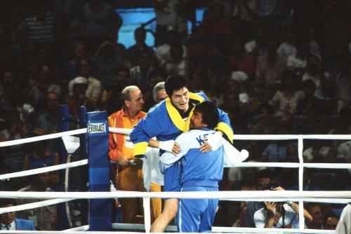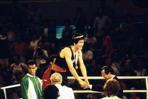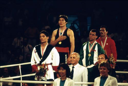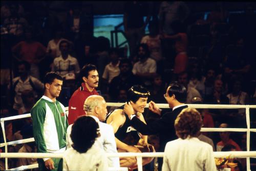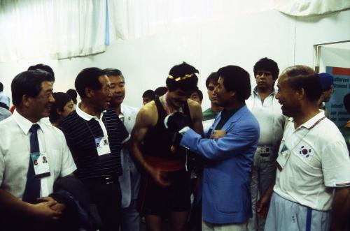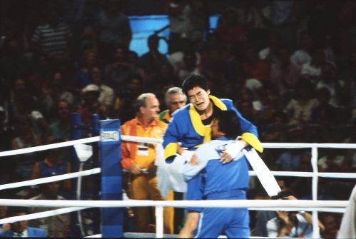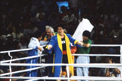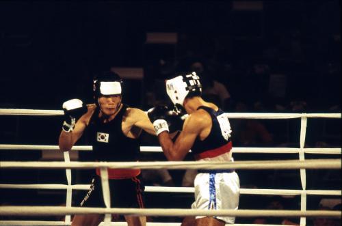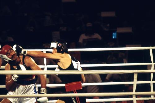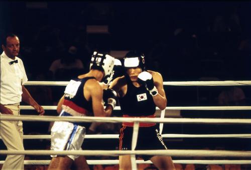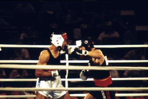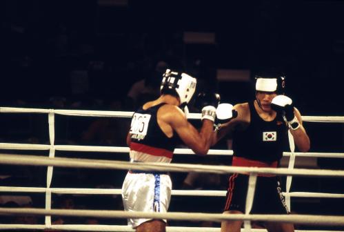 제23회 LA 올림픽 경기 종목 가운데 복싱 경기가 펼쳐지고 있다. 우리나라는 복싱에서 신준섭 선수가 금메달을 획득하였다.
