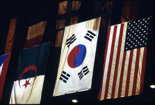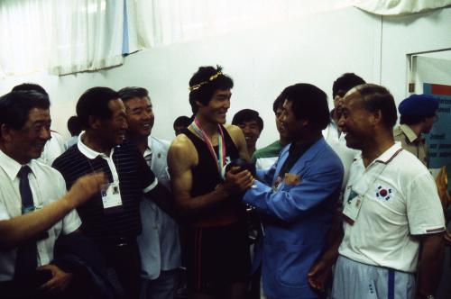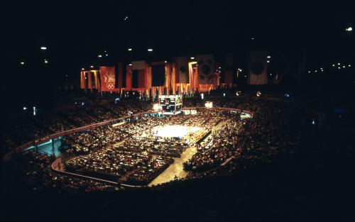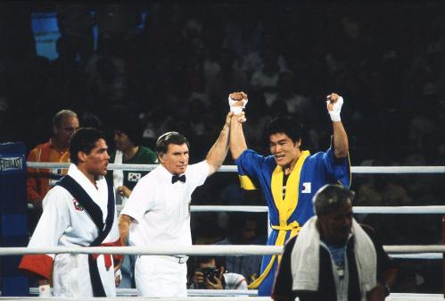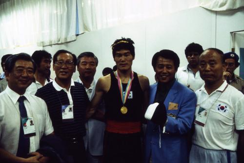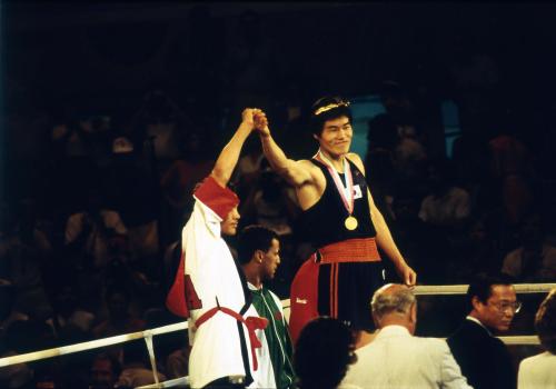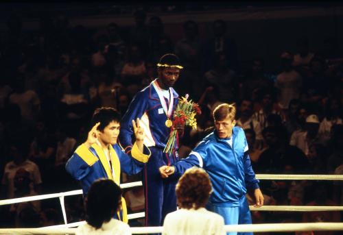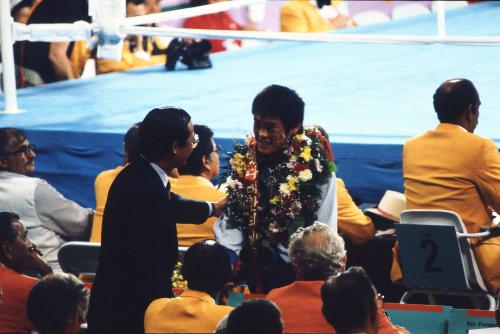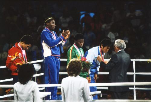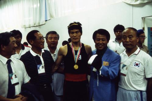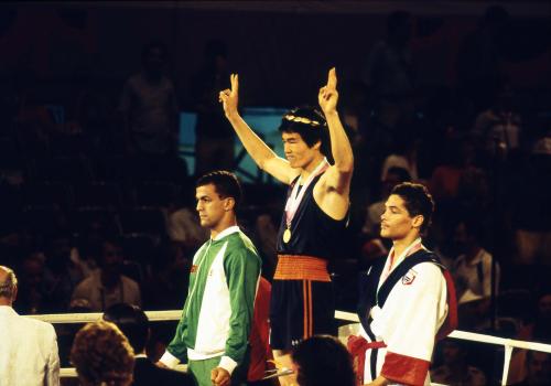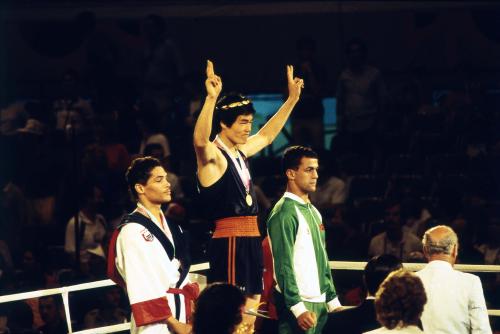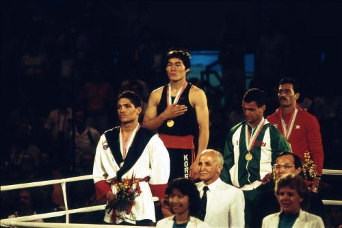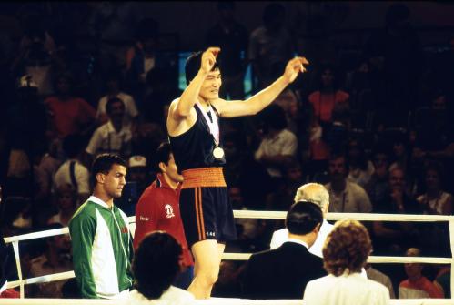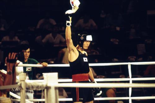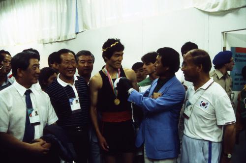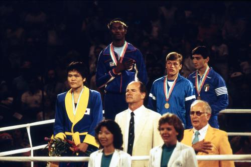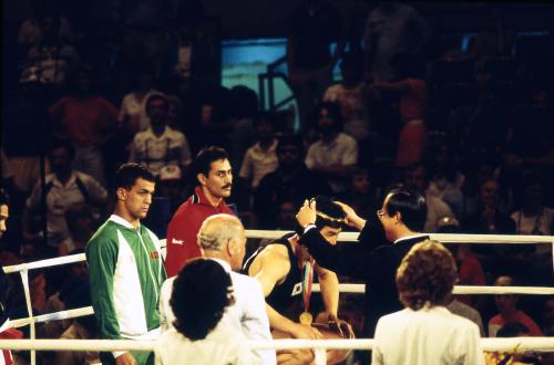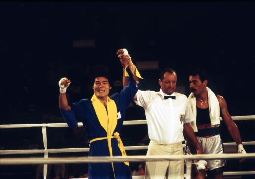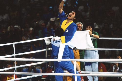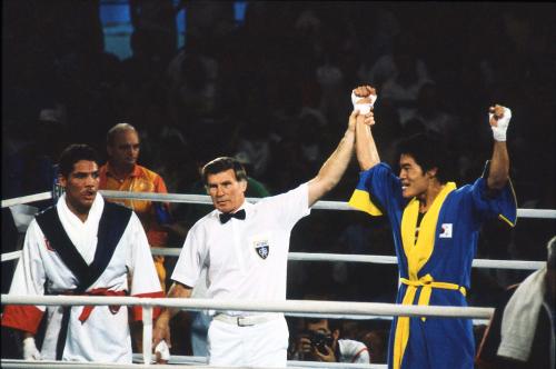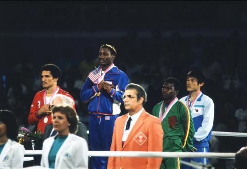제23회 LA 올림픽 경기 종목 가운데 복싱 경기가 펼쳐지고 있다. 우리나라는 복싱에서 신준섭 선수가 금메달을 획득하였다.