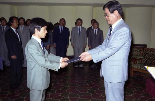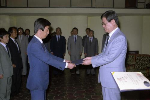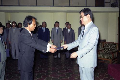 이원홍 문화공보부 장관이 5월 월례조회 우수공무원 표창을 하였다.