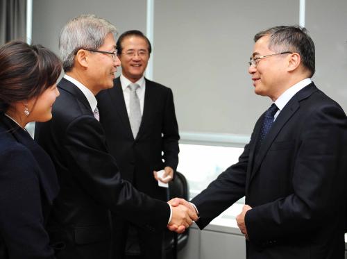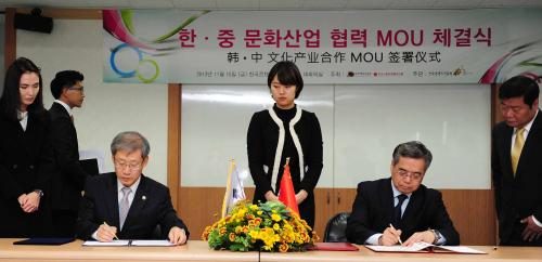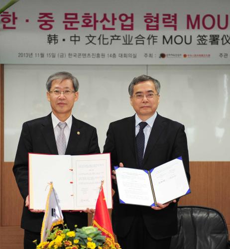 15일 서울 상암동 한국콘텐츠진흥원에서 문체부, 중국 문화부와의 지속적인 문화산업 협력 추진 기반을 마련하기 위한 ‘한-중 문화산업 협력 양해각서 체결식’이 열렸다. 이날 참석한 조현재 문화체육관광부 제1차관이 샹 자오룬 중국 문화부부장과 함께 양해각서에 서명을 마친 뒤에 관계자들과 기념촬영을 하고 있다.