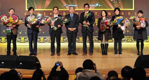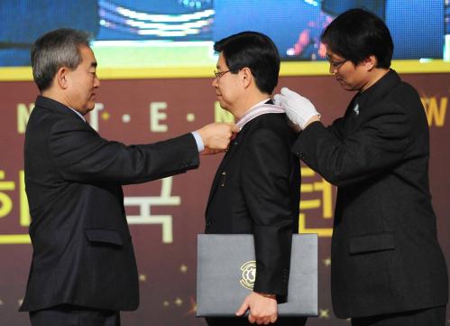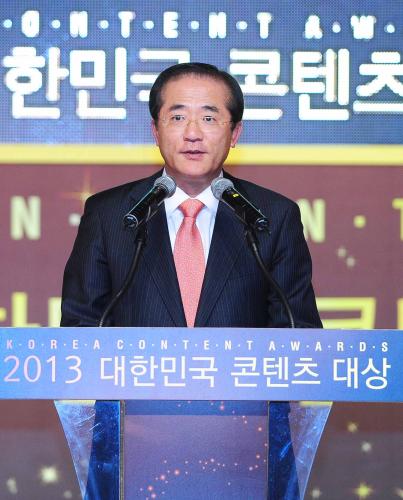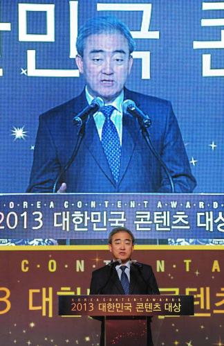 13일 서울 삼성동 코엑스에서 국민에게 감동과 재미를 주고 우리 콘텐츠 수출과 위상 제고에 기여한 콘텐츠산업 종사자들을 격려하기 위한 '2013 대한민국 콘텐츠 대상'이 열렸다. 이날 참석한 유진룡 문화체육관광부 장관이 길환영 KBS 사장에게 방송영상산업발전유공 '은관문화훈장' 수훈을 마친 뒤에 기념촬영을 하고 있다.