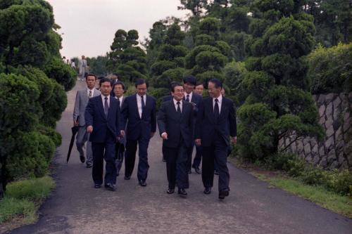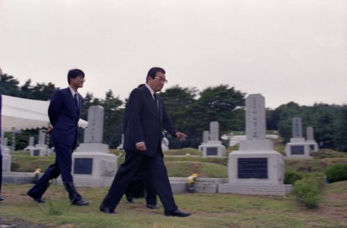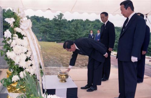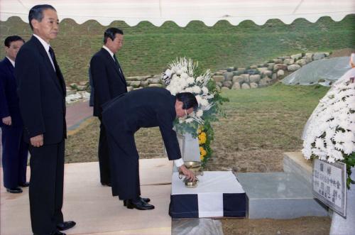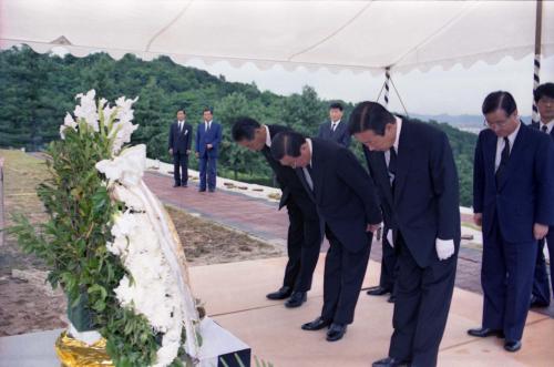 참석자 : 황인성 국무총리 인물상세정보 : 황인성 국무총리(좌2) 황인성 국무총리가 상하이 임시정부 당시 선열 5위에 대한 봉환식에서 안장된 묘소를 방문해 묵념을 하고 있다.