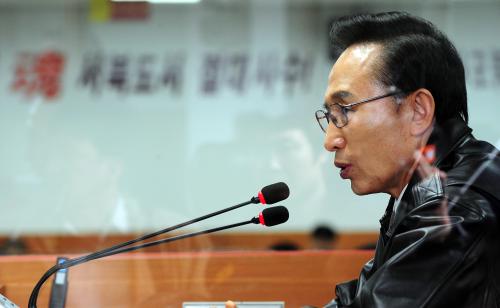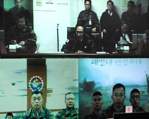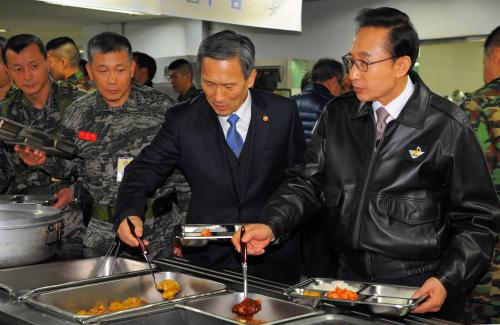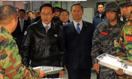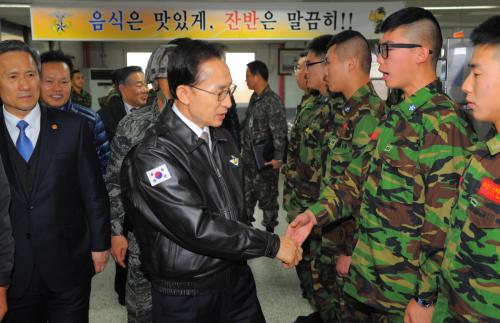이명박 대통령이 23일 경기도 서북도서방위사령부를 방문, 연평도, 백령도 해병장병들과 화상통화 후 연평도 주민과도 통화하고 있다.