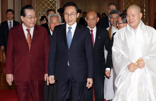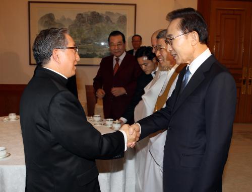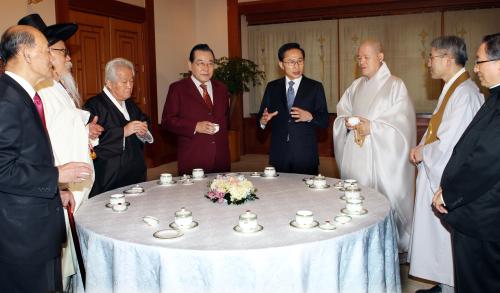 참석자 : 이명박 대통령.한국종교지도자협의회 대표자 이명박 대통령이 21일 오후 7대 종단 지도자들을 청와대로 초청, 북한 상황을 설명한 후 의견을 나누고 있다.