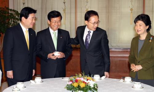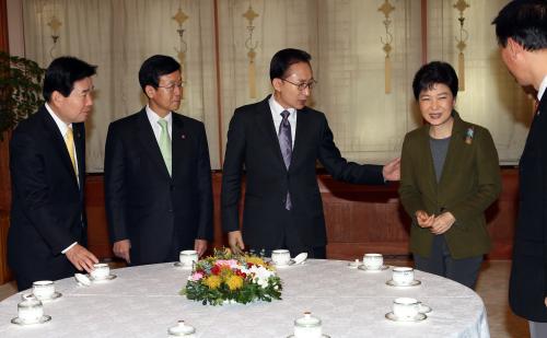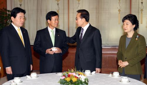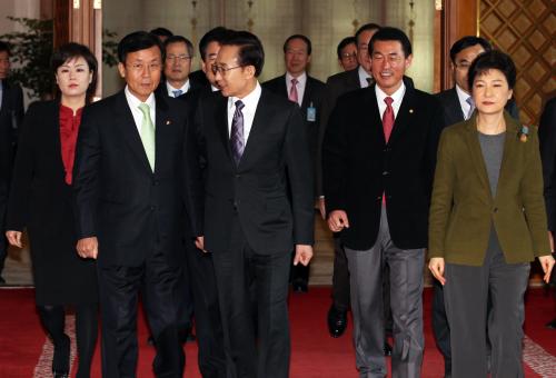 참석자 : 이명박 대통령.여.야대표 이명박 대통령이 22일 오전 청와대에서 한나라당 박근혜 비상대책위원장, 민주통합당 원혜영 공동대표 등 여야 지도부와 김정일 북한 국방위원장 사망과 관련한 초당적 대응방안을 논의하고 있다