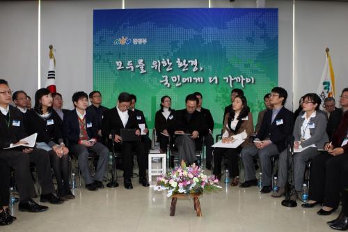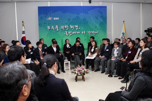 참석자 : 이명박 대통령.환경부 장관 이명박 대통령과 김황식 국무총리가 27일 경기도 과천시 정부과천청사에서 유영숙 장관의 2012년 환경부 업무보고를 듣고 있다