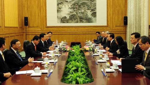 참석자 : 이명박 대통령.중국 국가주석 이명박 대통령과 후진타오(胡錦濤) 중국 국가주석이 14일 중국 베이징(北京) 인민대회당에서 한중 확대 정상회담을 열고 있다.