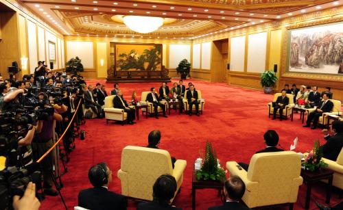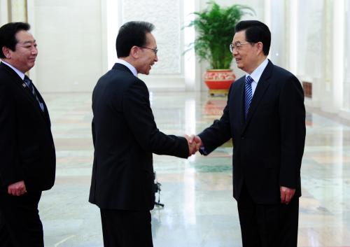 참석자 : 이명박 대통령.중,일 정상 이명박 대통령과 후진타오(胡錦濤) 중국 국가주석, 노다 요시히코(野田佳彦) 일본 총리가 14일 중국 베이징(北京) 인민대회당에서 열린 한ㆍ중ㆍ일 정상회담에서 기념촬영하고 있다.