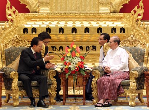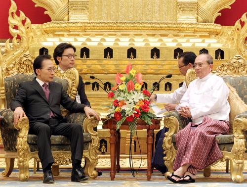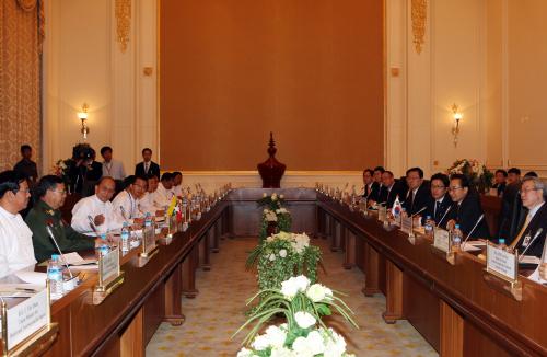 참석자 : 이명박 대통령.미얀마 대통령 미얀마를 공식방문중인 이명박 대통령이 14일 오후 네피도 대통령궁에서 열린 한국-미얀마 정상회담에서 테인 세인 대통령과 악수하고 있다.