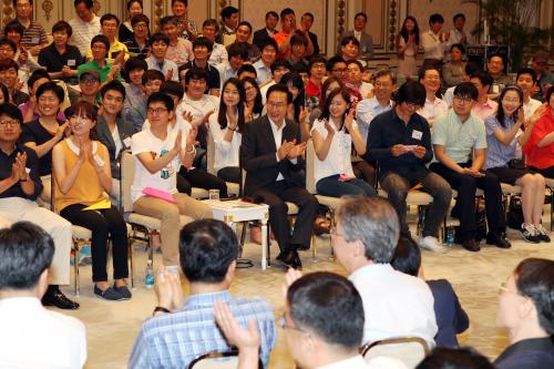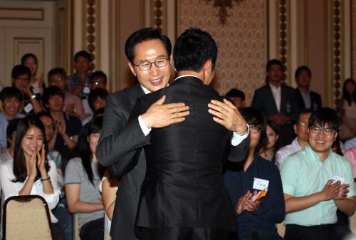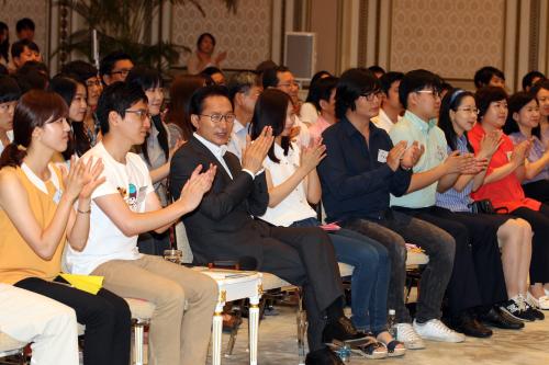 참석자 : 이명박 대통령.학생 창업인 = 이명박 대통령이 12일 청와대 영빈관에서 열린 학생 창업인 공감마당에 참석, 학생들과 대화를 나누고 있다.