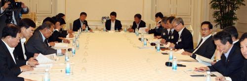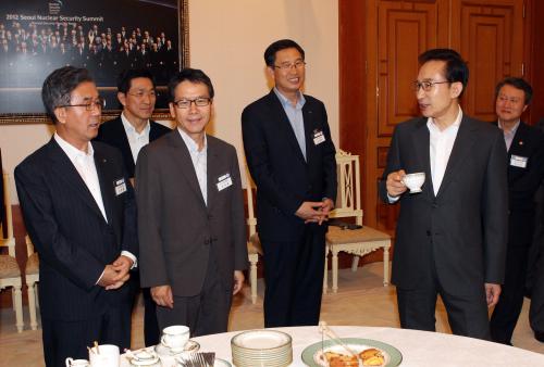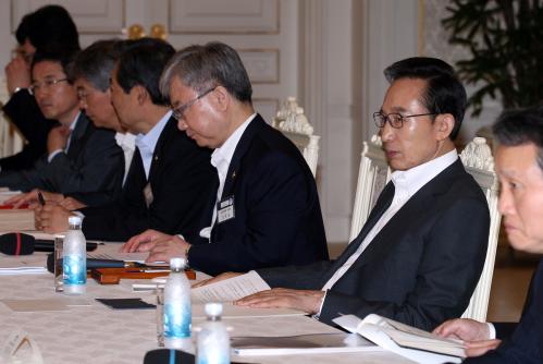 참석자 : 이명박 대통령.금융위원장 이명박 대통령이 19일 오전 청와대에서 맹형규 행안부장관(가운데), 김석동 금융위원장과 제128차 비상경제대책회의에 참석하고 있다