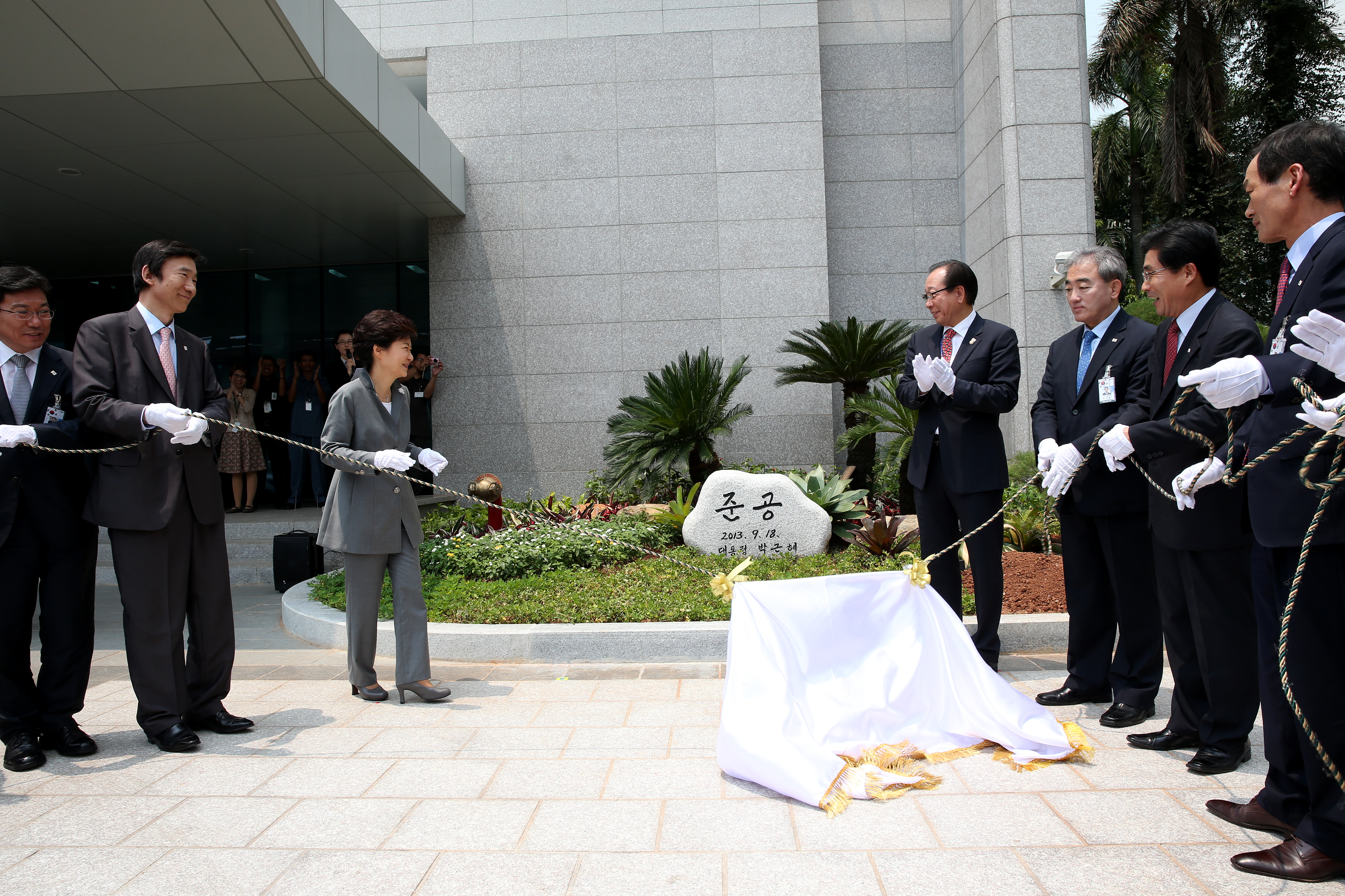 인도네시아를 국빈 방문 중인 박근혜 대통령이 11일 오후 주인도네시아 한국대사관 신청사 준공석 제막식에 참석, 준공석을 가린 가림천을 걷어내고 있다.