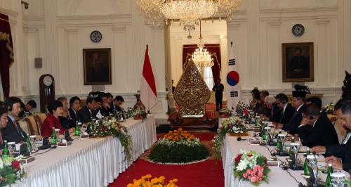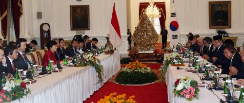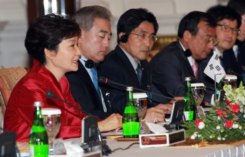 참석자 : 박근혜 대통령 박근혜 대통령과 수실로 밤방 유도요노 대통령이 12일 오후 인도네시아 대통령궁에서 확대정상회담을 하고 있다.