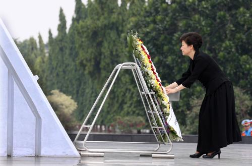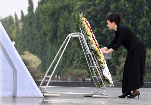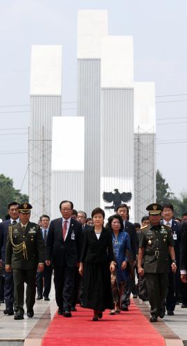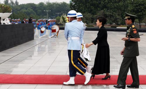 참석자 : 박근혜 대통령 인도네시아를 국빈방문중인 박근혜 대통령이 12일 오전 자카르타에 있는 '영웅묘지'를 방문하여 무명용사탑에 헌화를 하고있다.