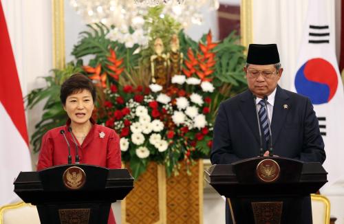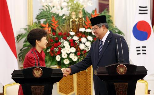 참석자 : 박근혜 대통령, 수실로 밤방 유도유노 대통령 인도네시아를 국빈 방문중인 박근혜 대통령이 12일 인도네시아 자카르타 대통령궁에서 수실로 밤방 유도유노 대통령과 공동 언론발표를 하고 있다.