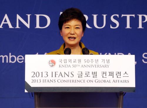박근혜 대통령이 14일 오전 서울 서초동 국립외교원에서 열린 ‘국립외교원 50주년 국제학술회의 개회식‘에 참석, 축사를 하고 있다.