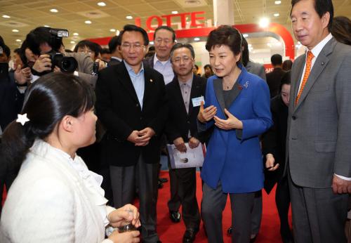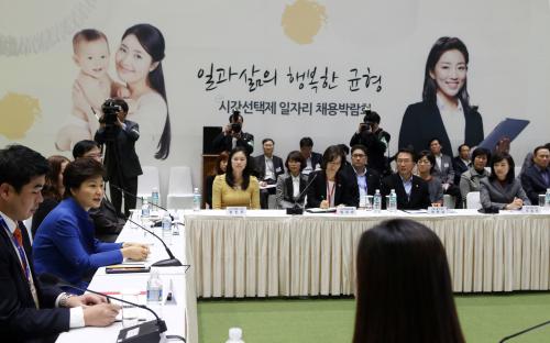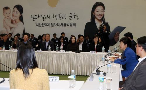 박근혜 대통령이 26일 오후 서울 삼성동 코엑스에서 열린 '2013 시간선택제 일자리 채용박람회'를 방문, 구직자 및 시간선택제 근로자 등이 참석한 가운데 열린 현장 간담회에서 모두발언을 하고 있다.