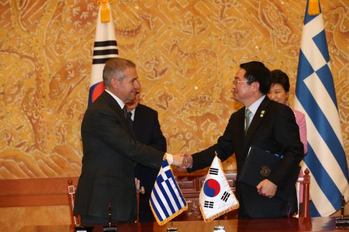 참석자 : 박근혜 대통령, 카롤로스 파풀리아스 그리스 대통령,백승주 국방부차관과 아타나시오스 다바키스 그리스 국방부 부장관