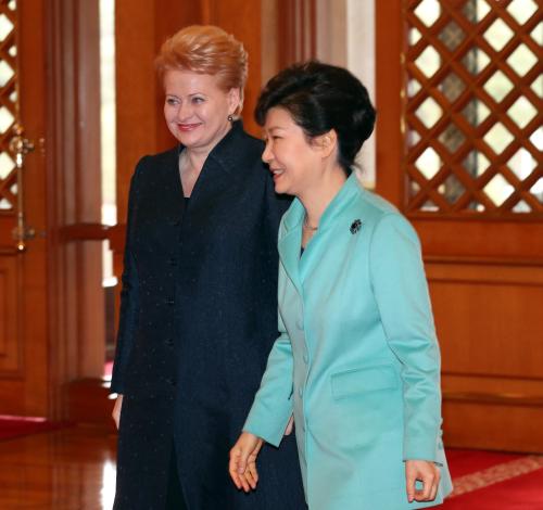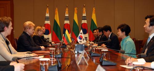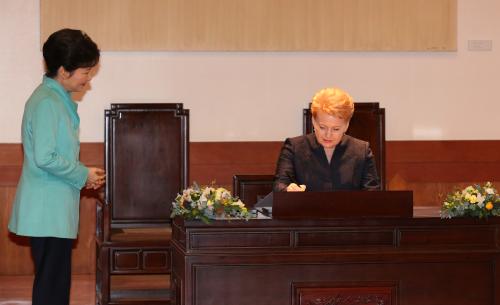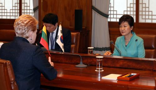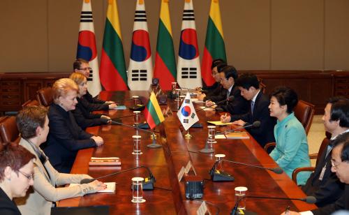 참석자 : 박근혜 대통령, 달리아 그리바우스카이테 리투아니아 대통령 박근혜 대통령이 18일 오후 청와대에서 달리아 그리바우스카이테 리투아니아 대통령과 한-리투아니아 정상회담을 하고 있다.