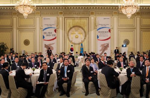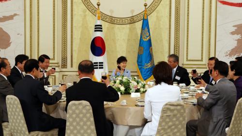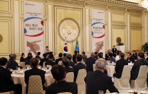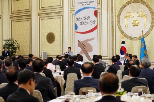 참석자 : 박근혜 대통령, 박용만 대한상공회의소 회장, 전국상공회의소 회장단 100여명 등 박근혜 대통령이 26일 오전 청와대 영빈관에서 열린 전국 상공회의소 회장단 오찬 간담회에 참석, 인사말을 하고 있다.