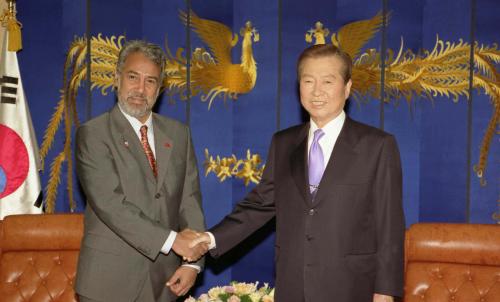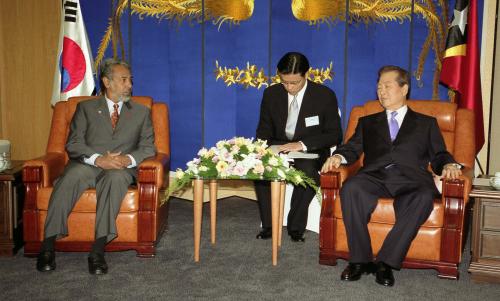 참석자 : 김대중 대통령, 동티모르 사나나 구스마오 대통령 김대중 대통령이 11일 서울 삼성동 코엑스 컨벤션센터에서 개막된 제2차 민주주의공동체(CD) 각료회의에 참석한 동티모르 사나나 구스마오 대통령을 면담하고 환담을 나누었다.